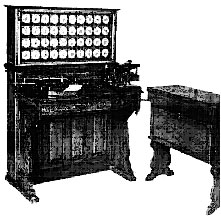 | 1887 an. In dieser Maschine benutzte er eine elektrifizierte Staffelwalze und eine Zähluhr ein. Der Zehnerübertrag wurde in einer Relaisschaltung gespeichert und bei ‚Zehnerübertragsimpuls' ausgeführt. Somit war dies keine mechanische Rechenmaschine mehr, sondern eine mit elektrischen Impulsen arbeitende Rechenmaschine. | |